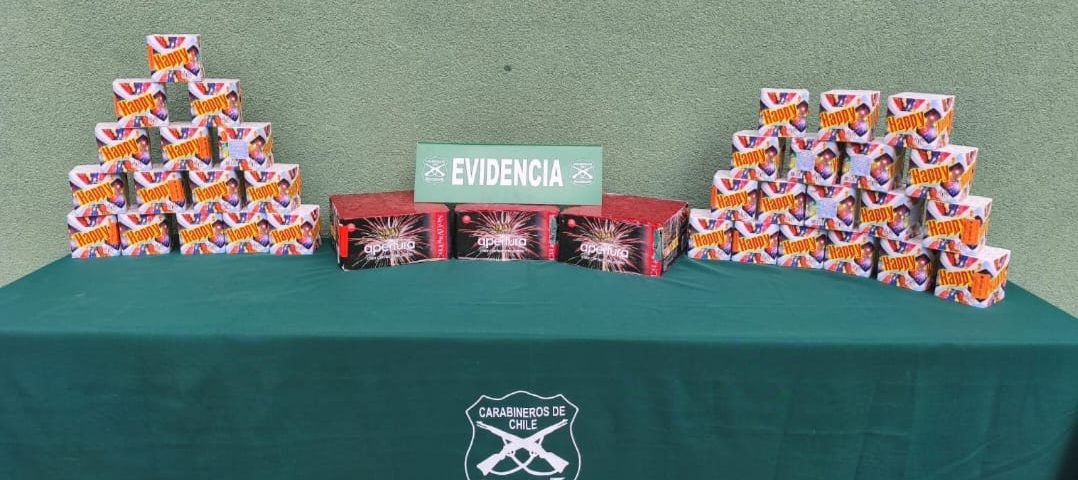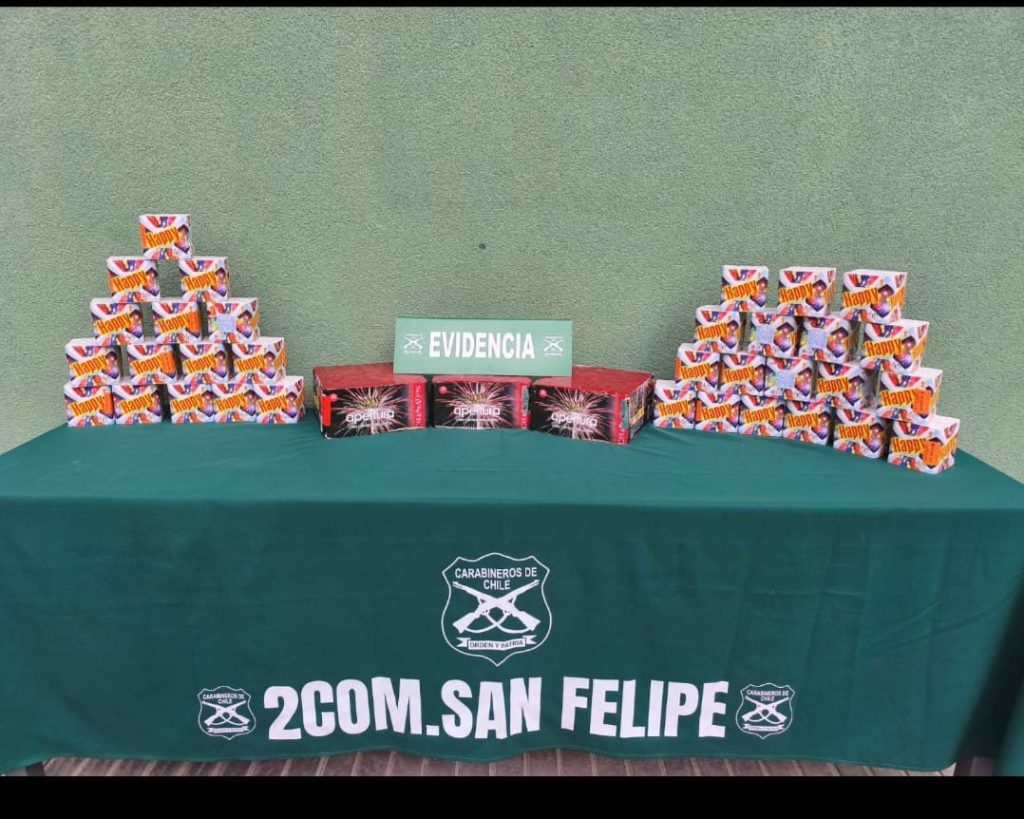 Con esta información, los funcionarios policiales coordinaron una compra controlada, concretando un encuentro en el sector de Hacienda Quilpué, comuna de San Felipe. En el lugar se efectuó la fiscalización del sujeto, encontrando en su poder dos tortas de fuegos artificiales de 16 tiros, por lo que se procedió a su detención inmediata por infracción al artículo 3° de la Ley de Control de Armas y Explosivos.