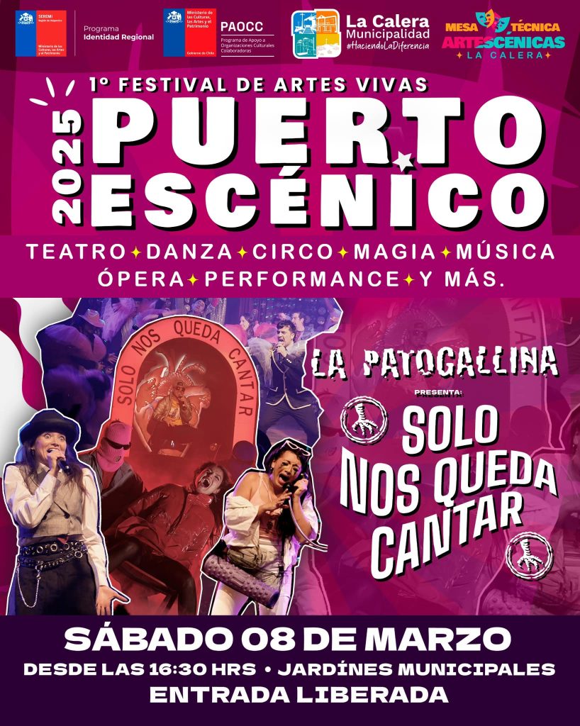 “Querida comunidad de La Calera, en el marco de la conmemoración del Día Internacional de la Mujer y potenciando las artes y la cultura, invitamos a todas y todos a acompañarnos al Primer Festival de las Artes Vivas, Puerto Escénico 2025. Esta iniciativa que realiza nuestro municipio en conjunto con la Seremi de la Cultura y las artes se llevará a cabo este sábado 8 de marzo a partir de las 16.30 horas en los jardines de nuestra municipalidad. En esta oportunidad disfrutaremos de la puesta en escena de la pieza teatral “Solo nos queda Cantar” de la destacada compañía Patogallina, junto a la presentación de danzas, magia, música, entre otras expresiones artísticas. La entrada es totalmente liberada, los esperamos.” Indicó el alcalde Johnny Piraíno.